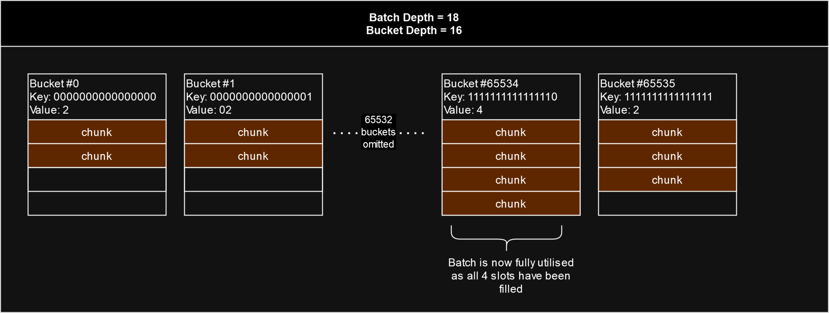 In the diagram below, the batch depth is 18, so there are or 4 slots for each bucket. The utilisation of a batch is simply the highest number of filled slots out of all 65536 entries or "buckets". In this batch, none of the slots in any of the buckets have yet been filled with 4 chunks, so the batch is not yet fully utilised. The most filled slots out of all buckets is 2, so the stamp batch's utilisation is 2 out of 4.
